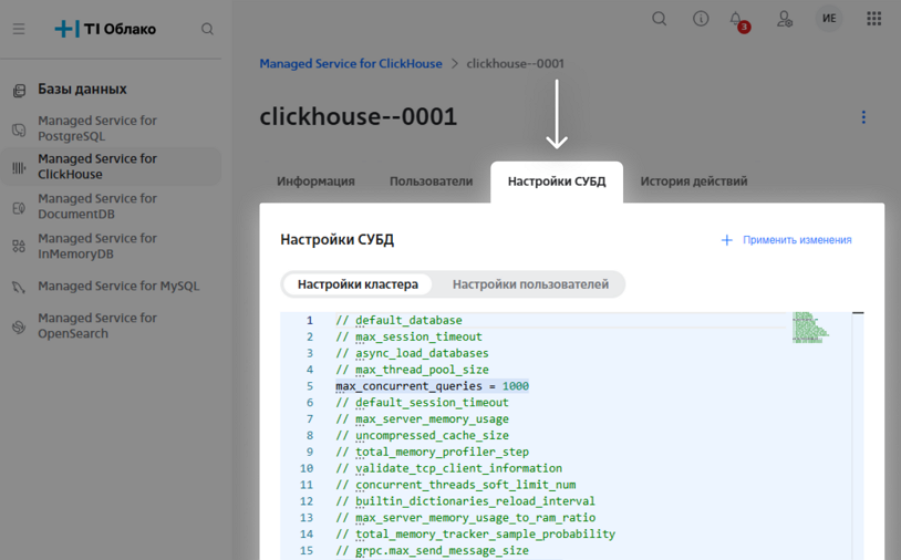 В заказанном кластере ClickHouse можно изменить настройки СУБД (появилась новая вкладка Настройки СУБД):