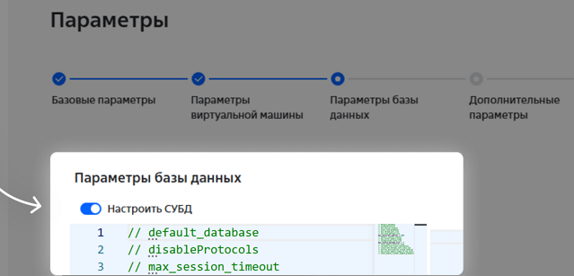 При заказе кластера ClickHouse можно указать настройки СУБД: