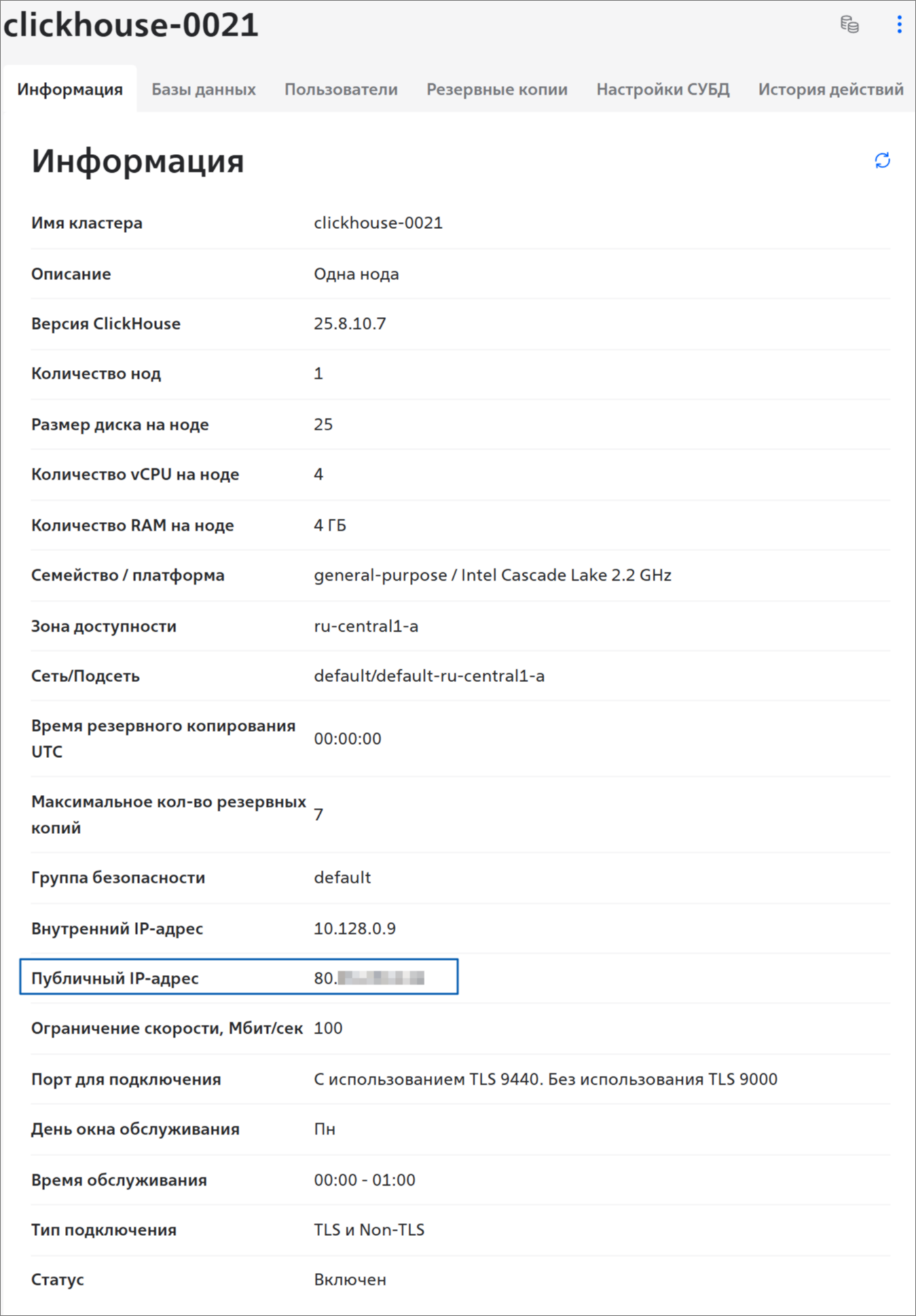 Если доступ к кластеру из сети Интернет не нужен, отключите публичный IP-адрес. Публичный IP-адрес отключается сразу от всех нод кластера.