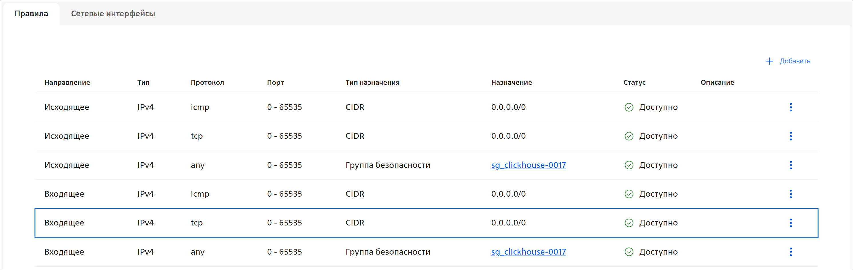 Перед подключением убедитесь, что в группе безопасности кластера есть правило, разрешающее входящий трафик для протокола TCP по порту: