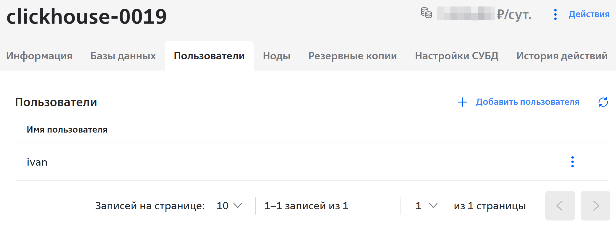- Нажмите на строку с кластером, в котором нужно добавить пользователя.