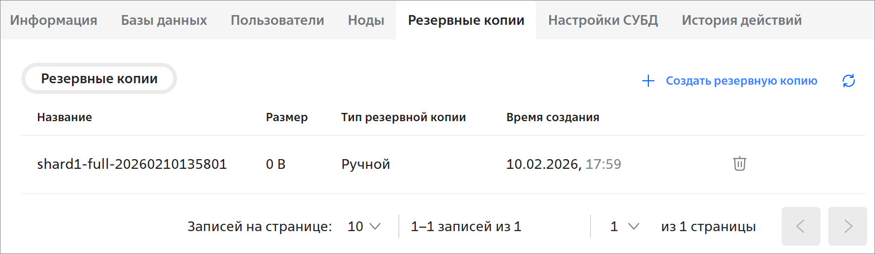 - Нажмите на кнопку + Создать резервную копию — появится запись о создании резервной копии: