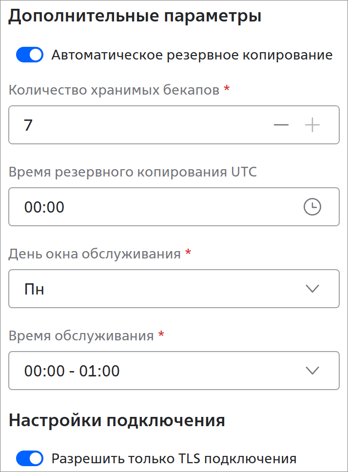Разрешить только TLS подключения — активируйте переключатель, если требуется подключаться к кластеру только по TLS .