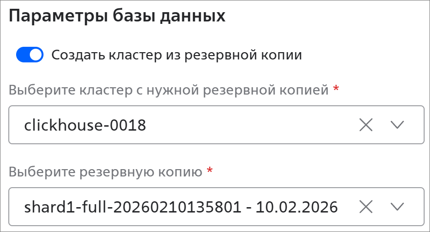 - Создать кластер из резервной копии — активируйте переключатель, чтобы создать кластер из резервной копии;