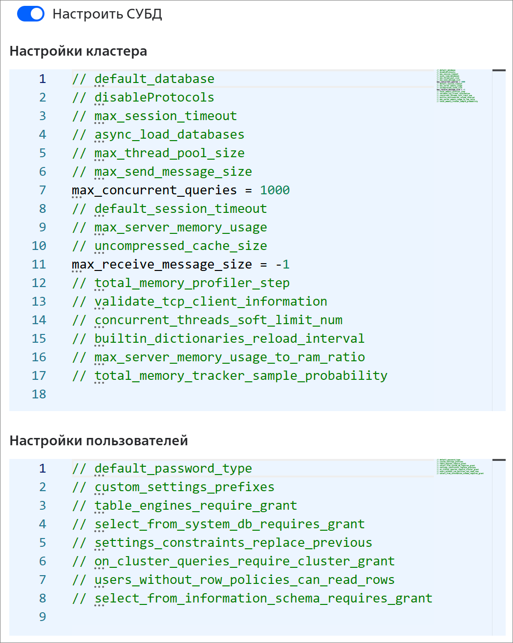 - Настроить СУБД — активируйте переключатель, если необходимо изменить параметры СУБД.