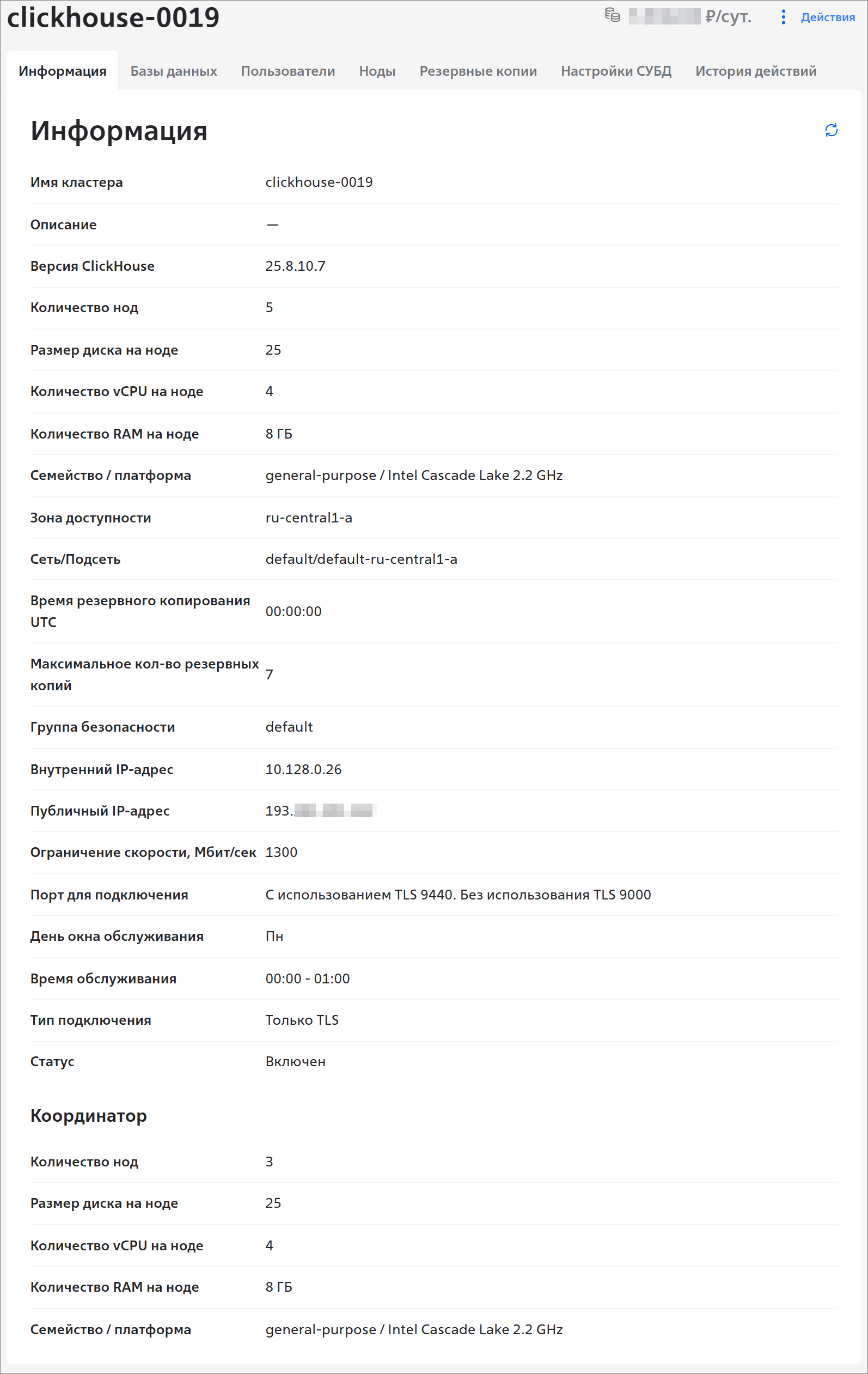 - на вкладке Ноды отображается список нод в кластере, их роли, внутренние и публичные IP-адреса. В кластере с 1 нодой вкладка Ноды не отображается;