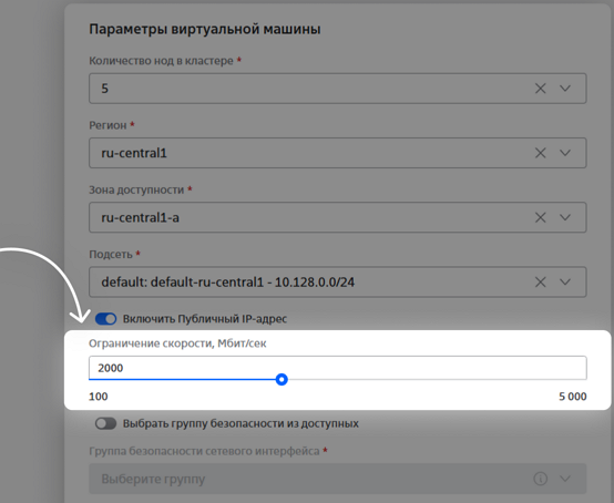 Если в кластере DocumentDB подключен публичный IP-адрес, вы можете управлять ограничением пропускной способности канала, выбирая значение от 100 до 10 000 Мбит/сек.