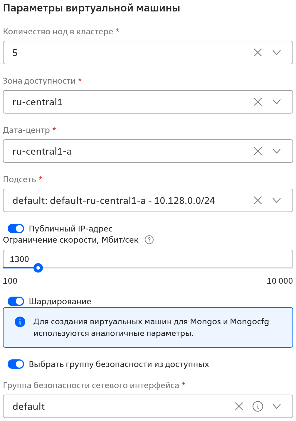 - Шардирование — активируйте переключатель, чтобы распределить данные по шардам, если планируете высокую частоту запросов к базе данных и быстрый рост количества данных. Шардирование нельзя активировать, если выбрана 1 нода;