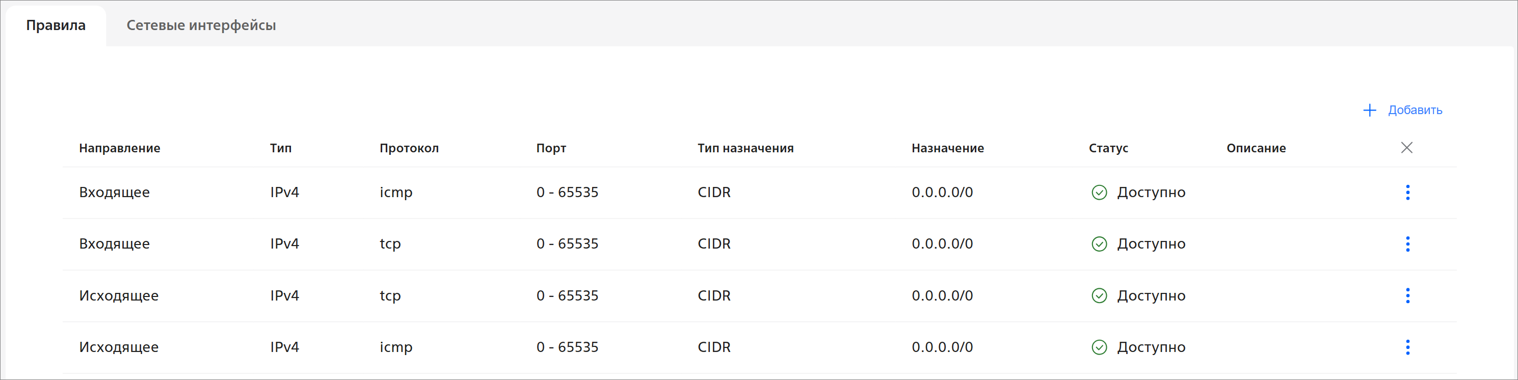 Группа безопасности — правила, контролирующие входящий и исходящий трафик кластера. Подробнее см. раздел Группы безопасности.