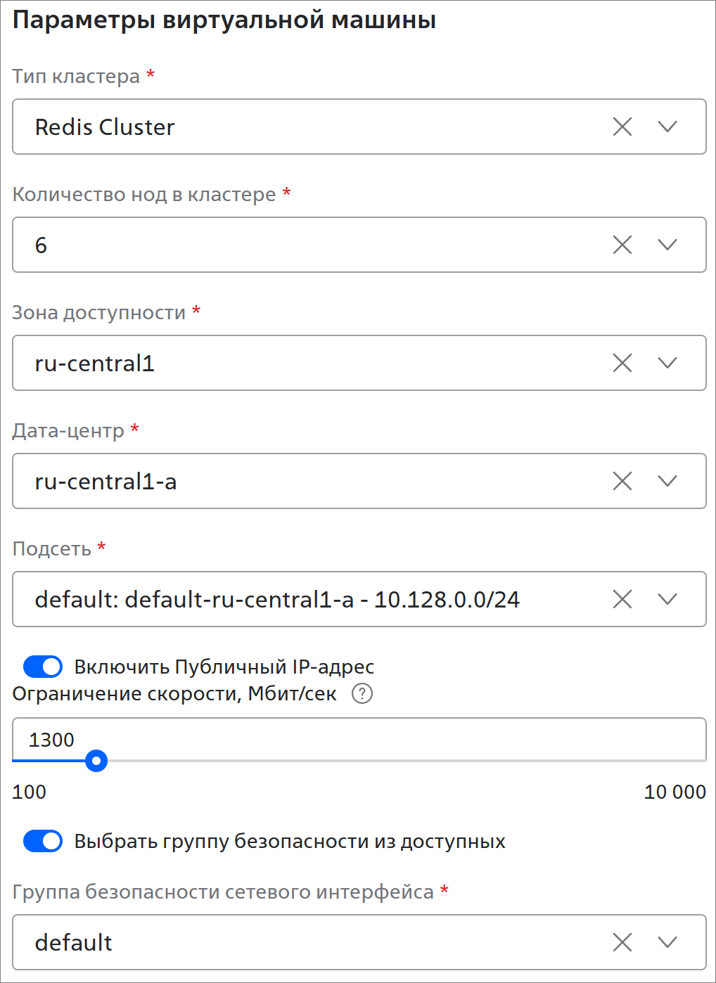Параметры виртуальной машины:- Тип кластера * — конфигурация кластера InMemoryDB: