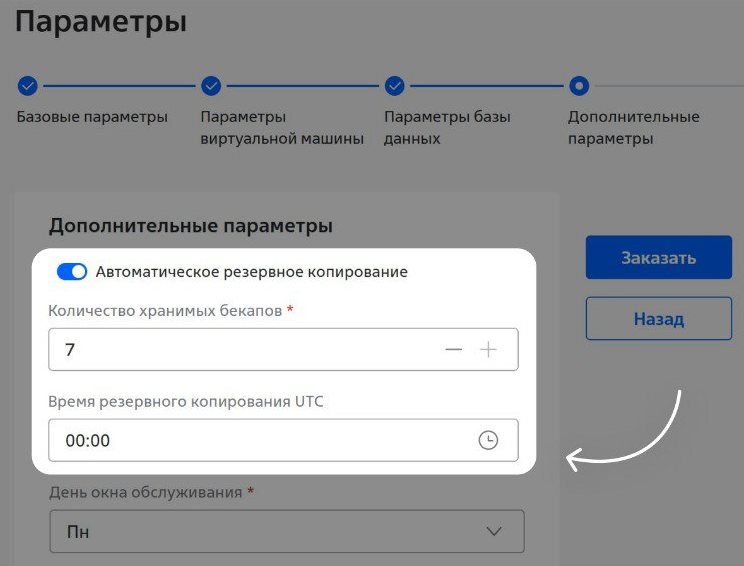При создании кластера Managed Service for MySQL теперь можно настроить резервное копирование — количество хранимых резервных копий и время резервного копирования: