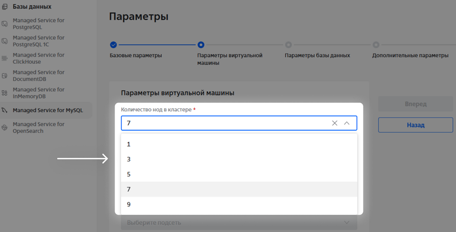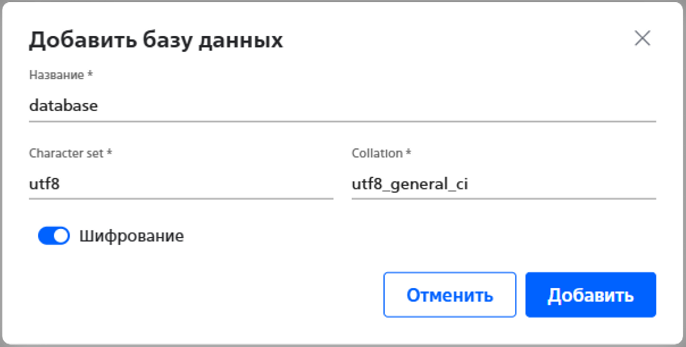 В заказанном кластере MySQL можно создать базу данных: