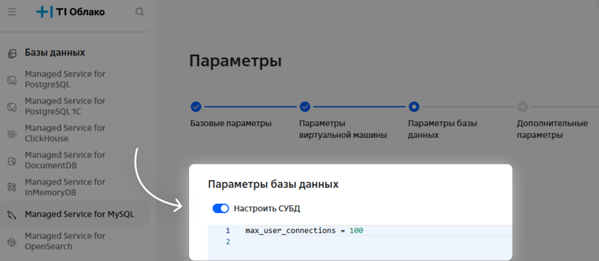 При заказе кластера MySQL можно указать настройки СУБД. Например, в переменной max_user_connections можно указать максимальное количество одновременных соединений: