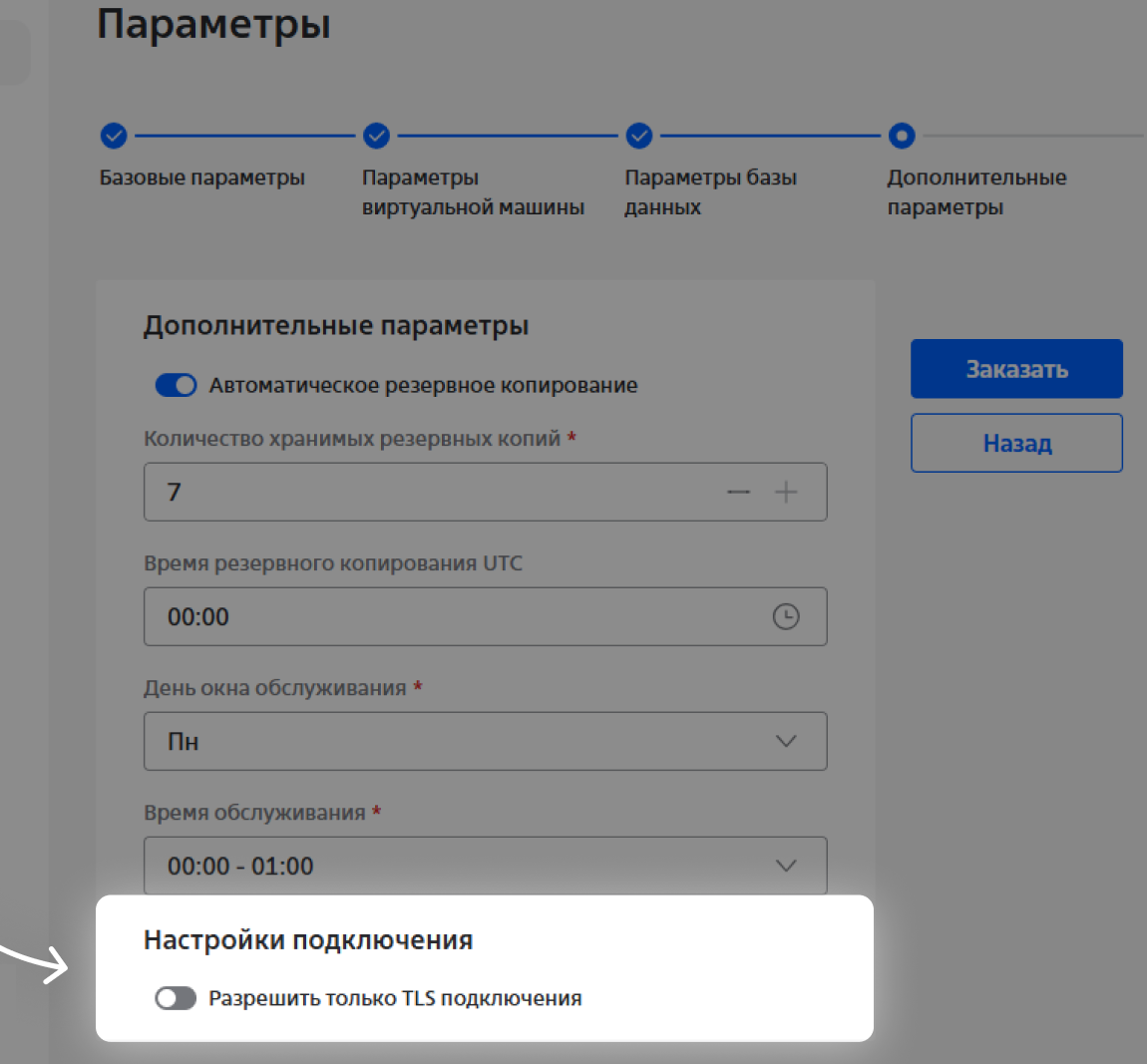В форме создания кластера появился переключатель Разрешить только TLS подключения. Если он активирован, то пользователи смогут подключаться к базе данных, используя только зашифрованное соединение.