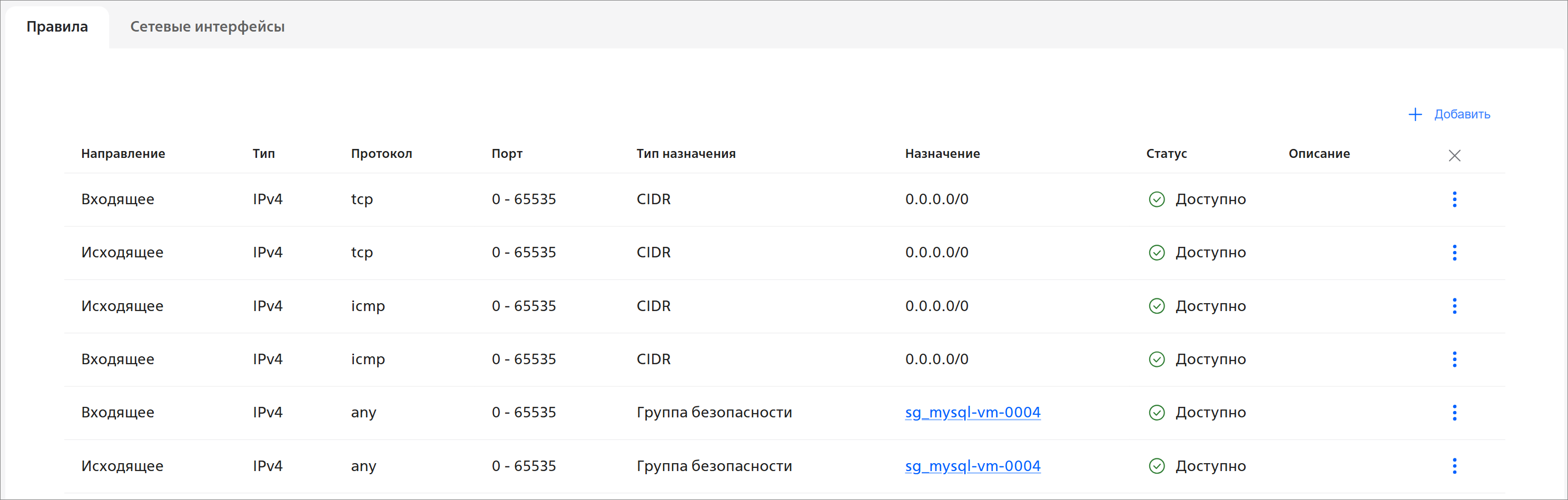 Группа безопасности для кластера MySQL содержит следующие правила: