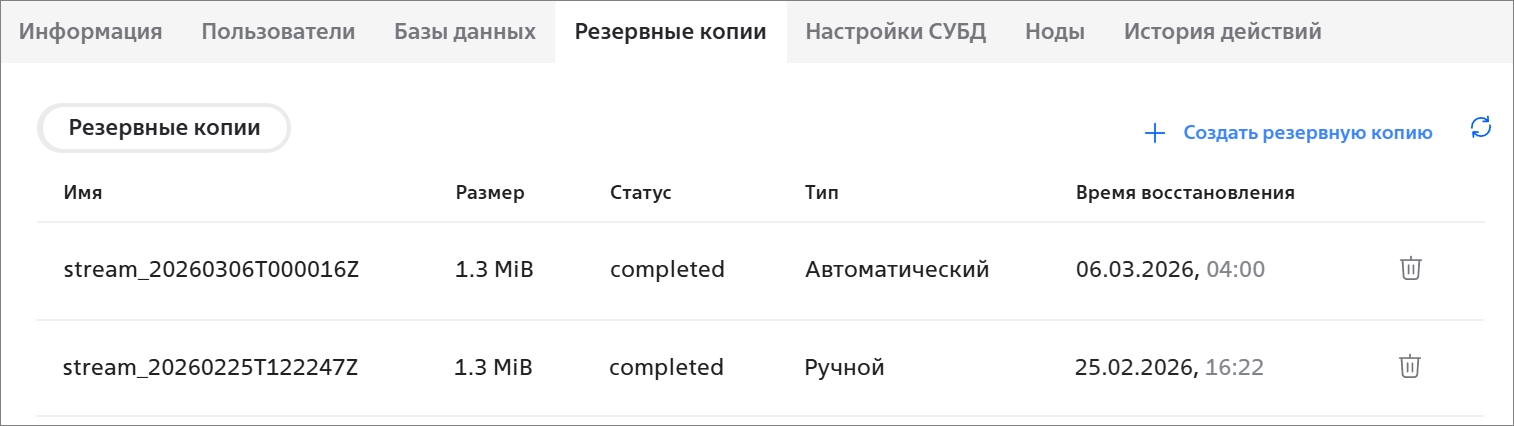 - автоматическое — полная резервная копия всех баз данных кластера. Автоматическое создание резервных копий включается при создании кластера. Резервная копия создаётся ежедневно в указанное время.