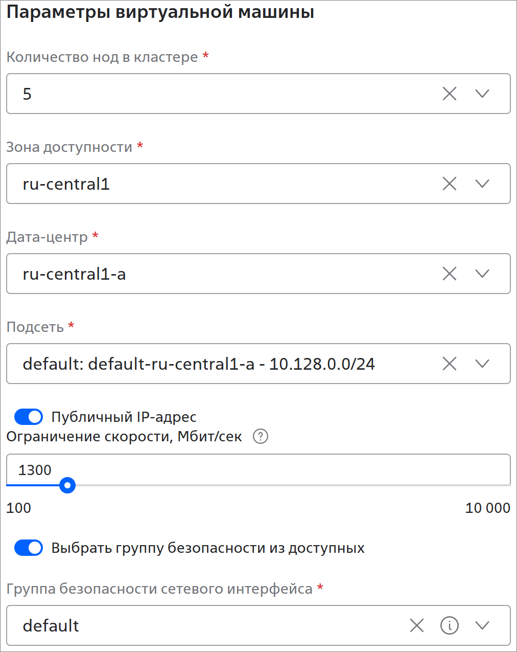 Параметры виртуальной машины:- Количество нод в кластере * — 1, 3, 5, 7 или 9;