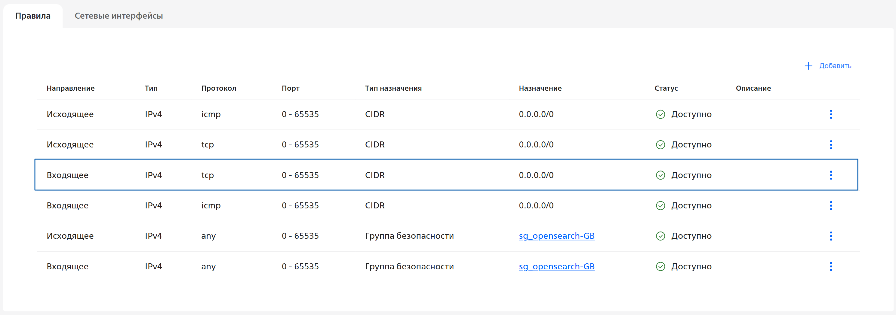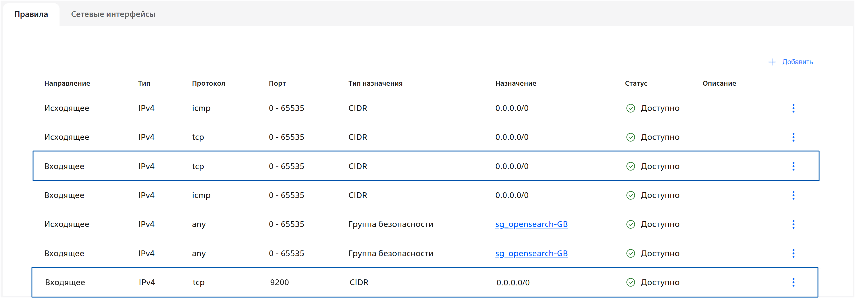 Перед подключением убедитесь, что в группе безопасности кластера есть правило, разрешающее входящий трафик по порту 9200 для протокола TCP. Если в группе безопасности кластера нет такого правила, добавьте его.