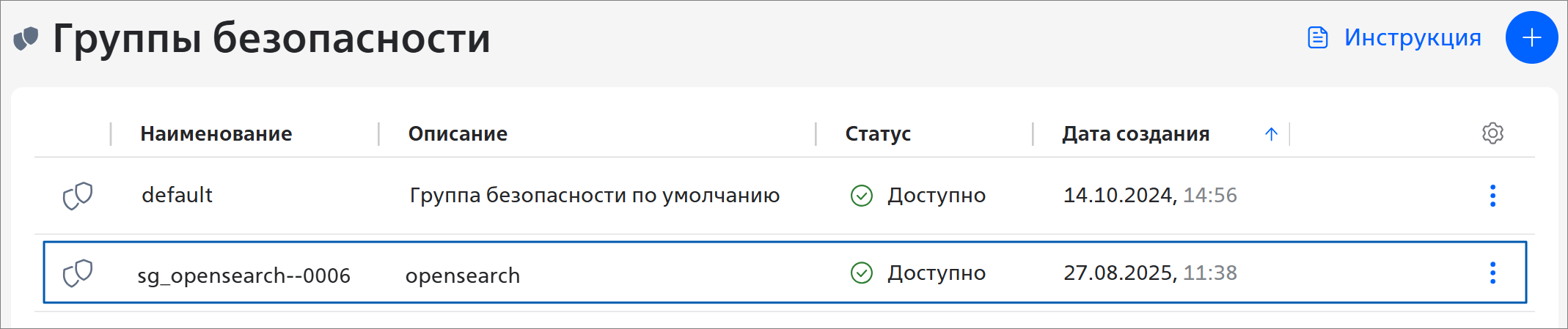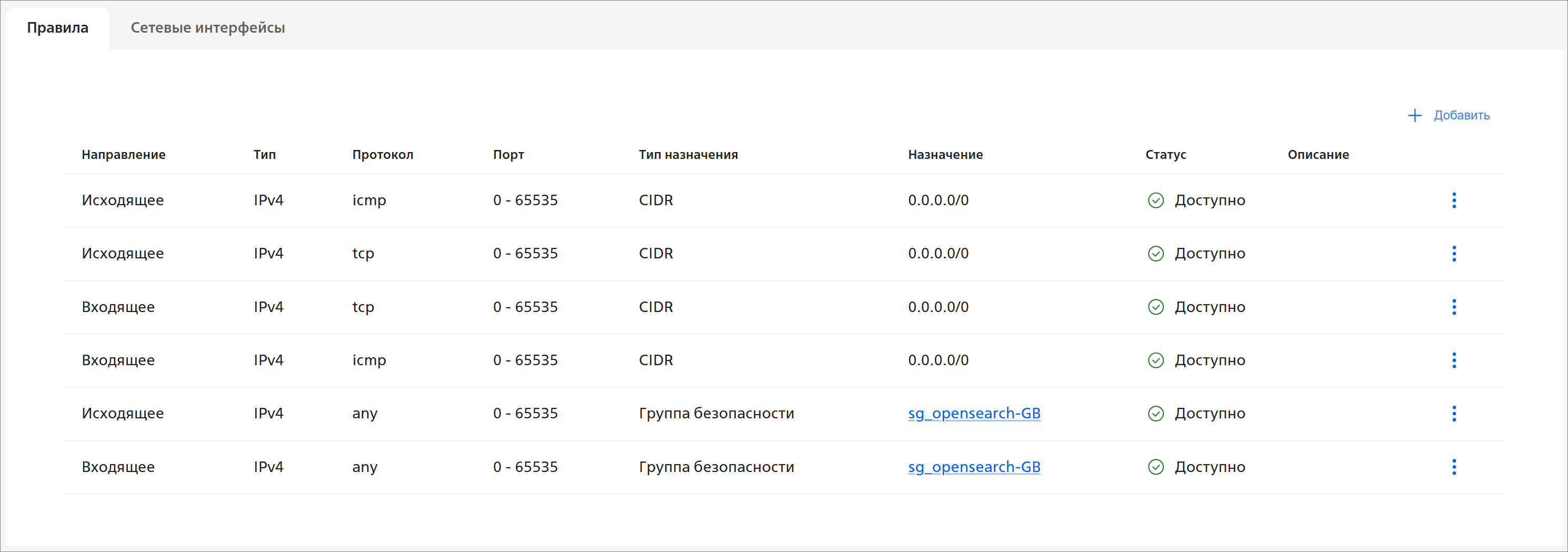 Если при создании кластера OpenSearch не был активирован переключатель Выбрать группу безопасности из доступных, то группа безопасности sg_<имя кластера> создаётся автоматически: