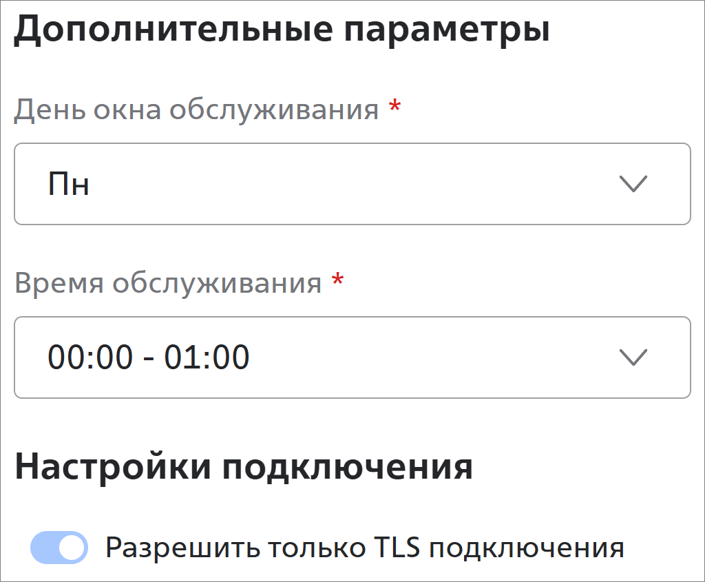 Дополнительные параметры:- День окна обслуживания * и Время обслуживания * — день недели и интервал времени (в вашем часовом поясе), когда специалисты Т1 Облако могут выполнять технические работы.