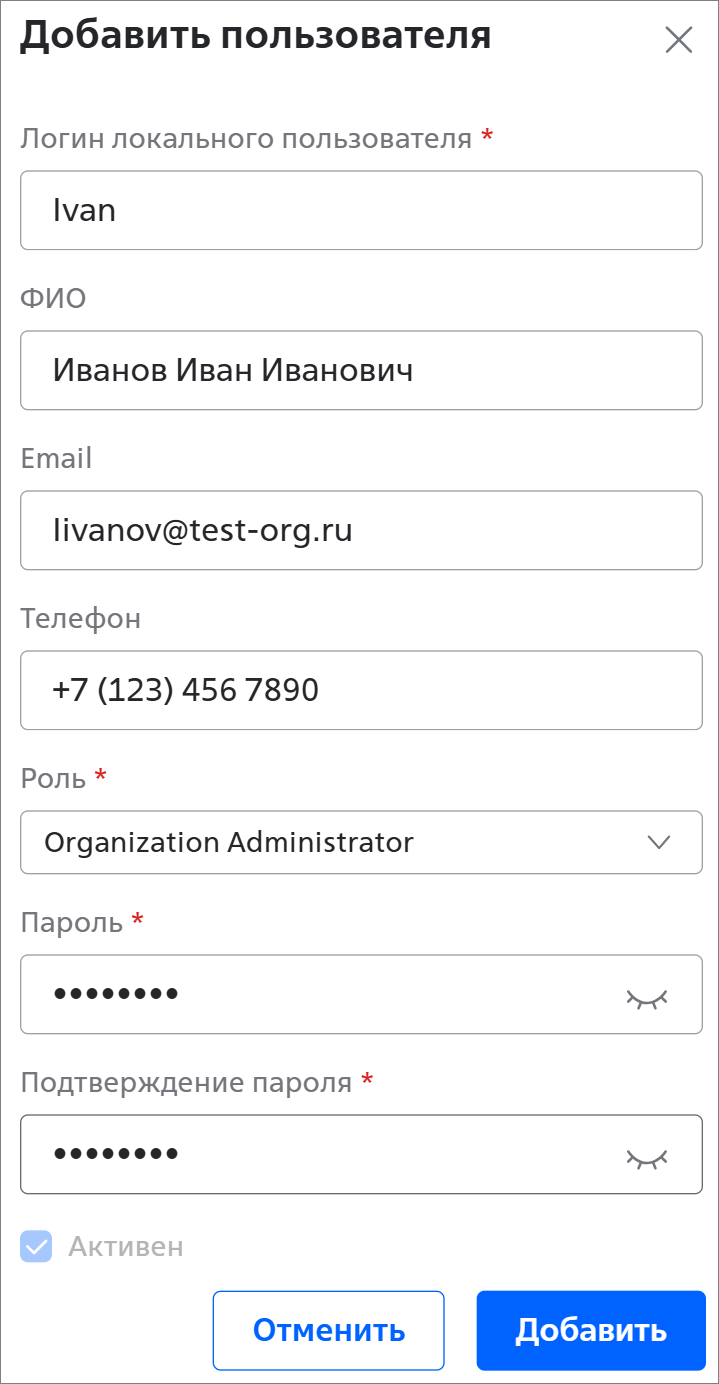 Активен— флажок установлен по умолчанию. Предоставляет доступ к платформе VMware Cloud Director. Если доступ не нужен, после добавления пользователя измените его данные и снимите флажок.
