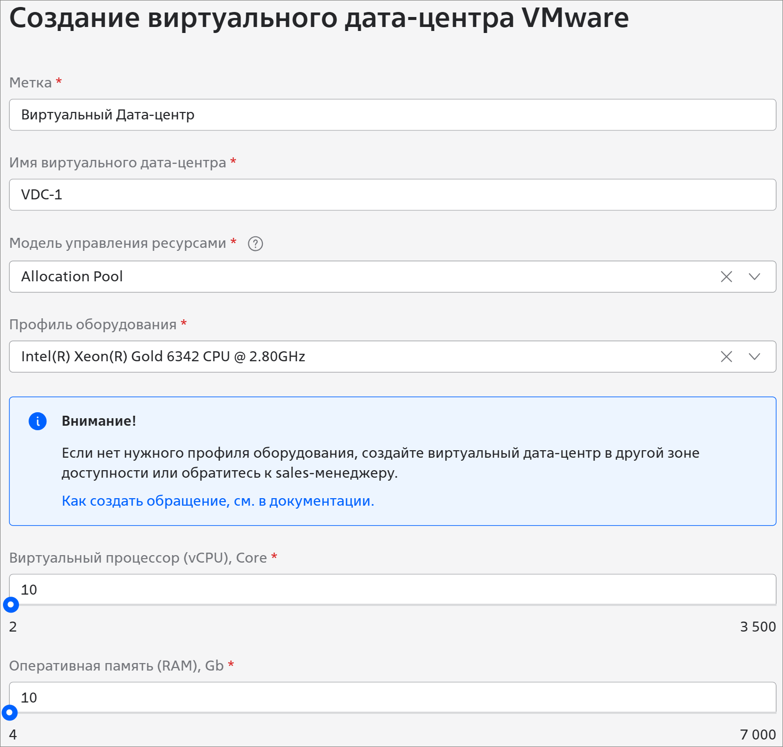 Если в вашем проекте нет нужного профиля оборудования, создайте виртуальный дата-центр в другой зоне доступности или обратитесь к sales-менеджеру; - Виртуальный процессор (vCPU), Core * — количество процессоров. Значение задаётся только при модели управления ресурсами Allocation Pool;