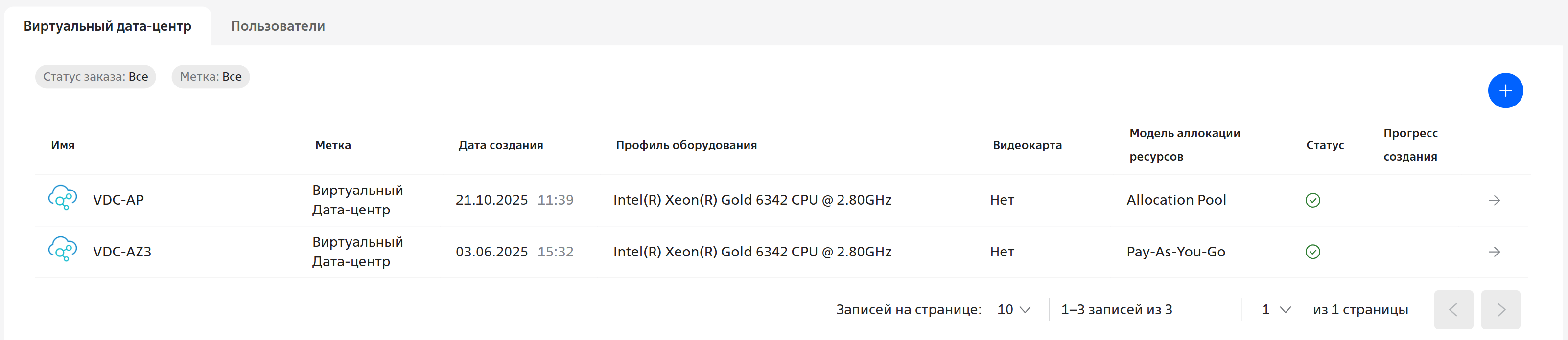 - Нажмите на строку с организацией, в которой нужно создать виртуальный дата-центр.
