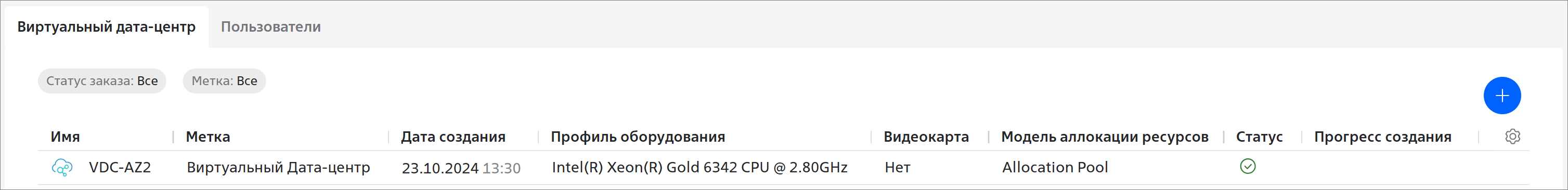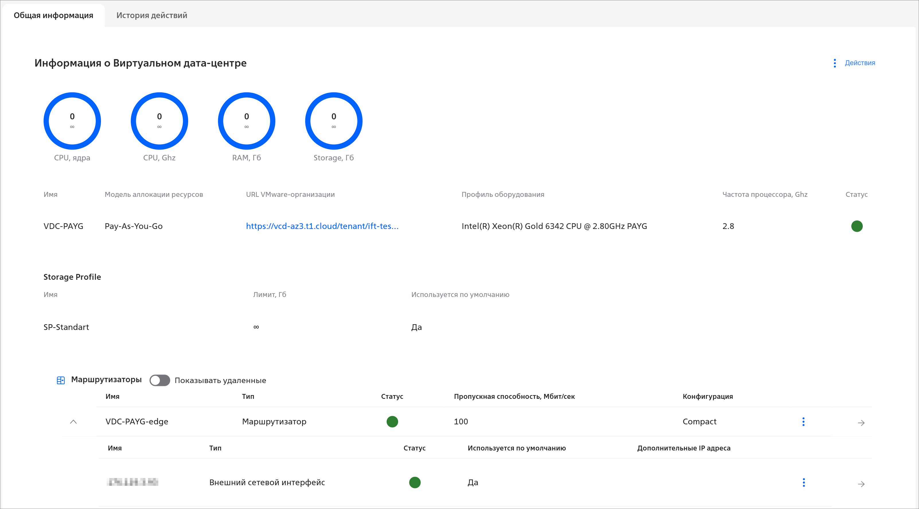 Чтобы посмотреть подробную информацию о виртуальном дата-центре, нажмите на строку с нужным виртуальным дата-центром. Откроется страница с информацией о виртуальном дата-центре: