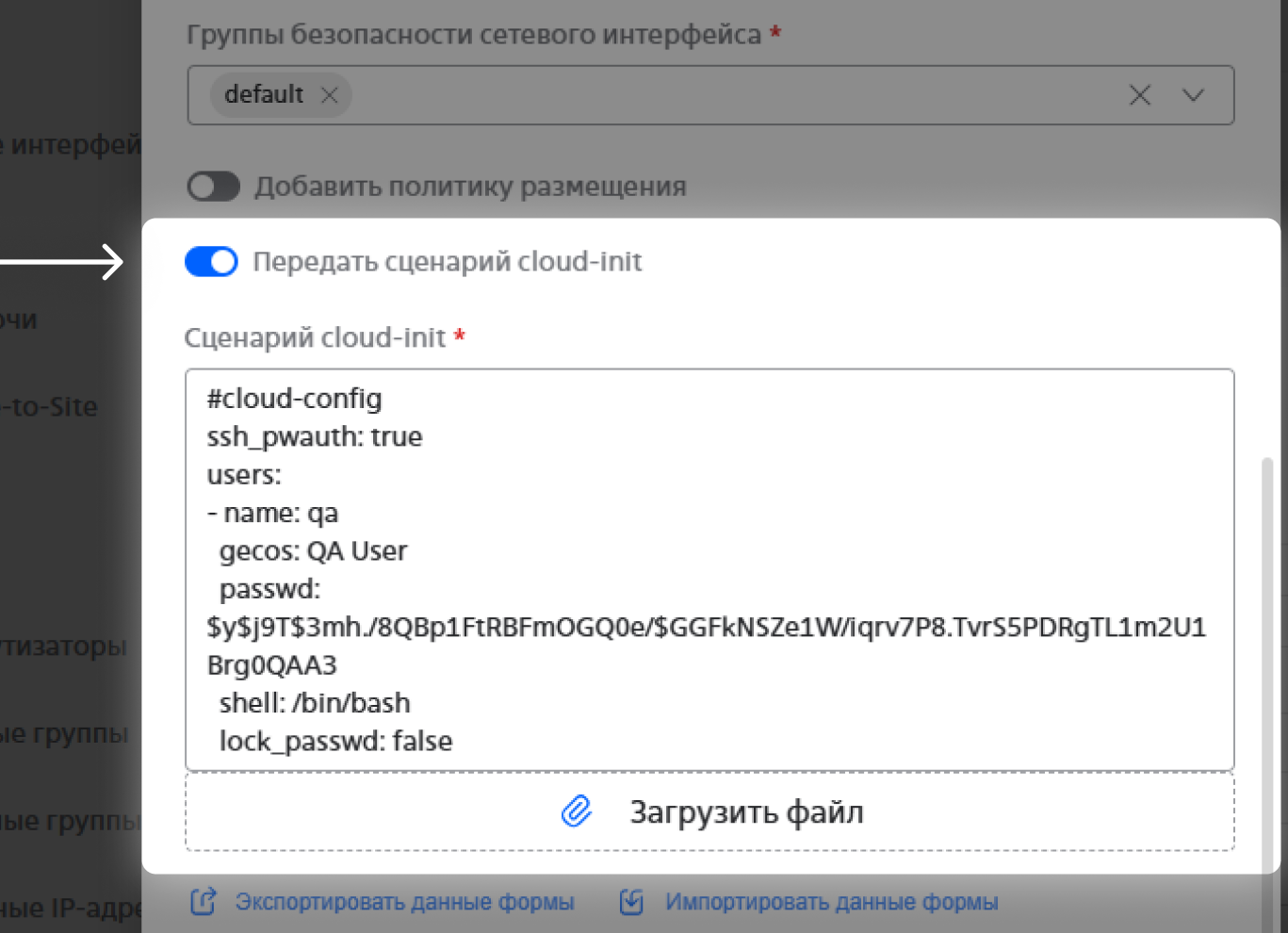 При восстановлении сервера из резервной копии можно Передать сценарий cloud-init. С помощью сценария (в формате YAML или shell) можно задать свои настройки сервера: