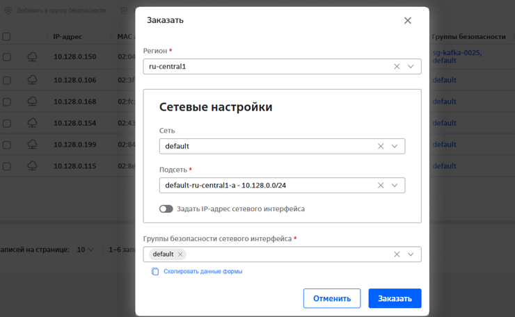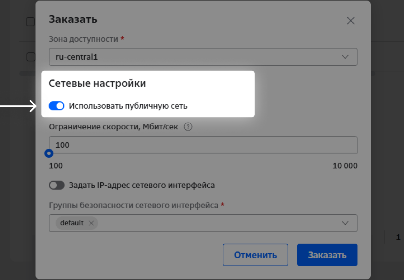 Теперь вы можете выделить публичный IP-адрес на сетевой интерфейс сервера. Для этого добавили опцию Использовать публичную сеть: