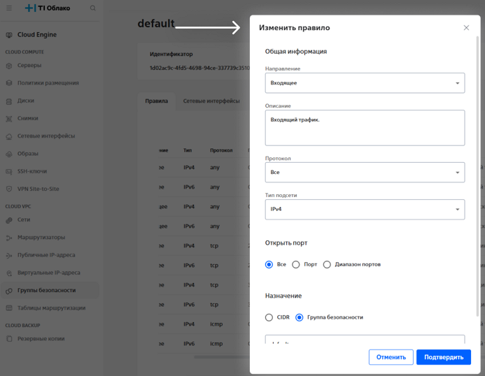 У правила можно изменить протокол, тип подсети, порт, CIDR.
