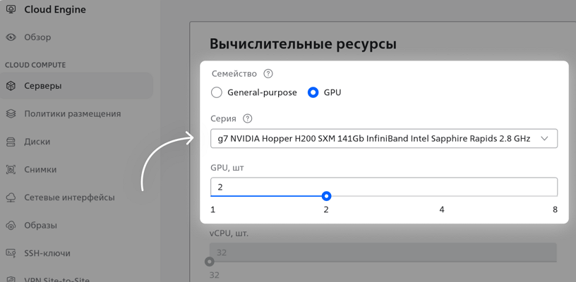 Теперь сервер можно заказать с GPU-процессором — появилось новое семейство Gpu с конфигурацией g1 NVIDIA Hopper H100: