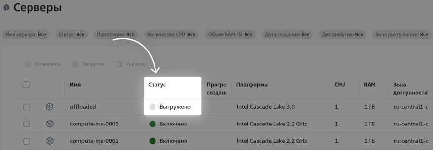 Если заказанный сервер (в разделе Cloud Engine) выключен более 2 часов, то статус сервера с Выключено изменяется на Выгружено. В результате сервер не занимает место (vCPU, RAM) на платформе виртуализации: