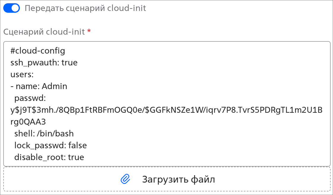 - Передать сценарий cloud-init — активируйте переключатель, чтобы задать свои настройки сервера. Напишите сценарий cloud-init в поле или загрузите текстовый файл. Сценарий может быть в формате YAML или shell: