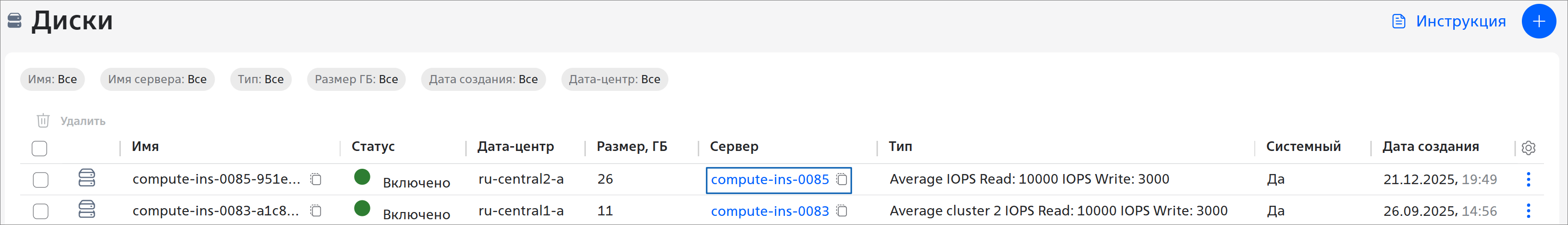 - Перейдите в раздел Ресурсы → Cloud Engine → Диски.