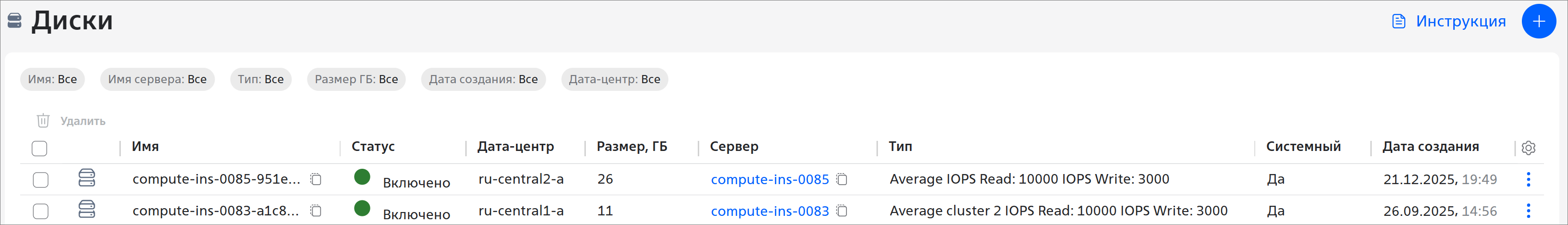 - Дополнительный диск, не подключенный к серверу — диск, который можно подключить к любому созданному серверу.