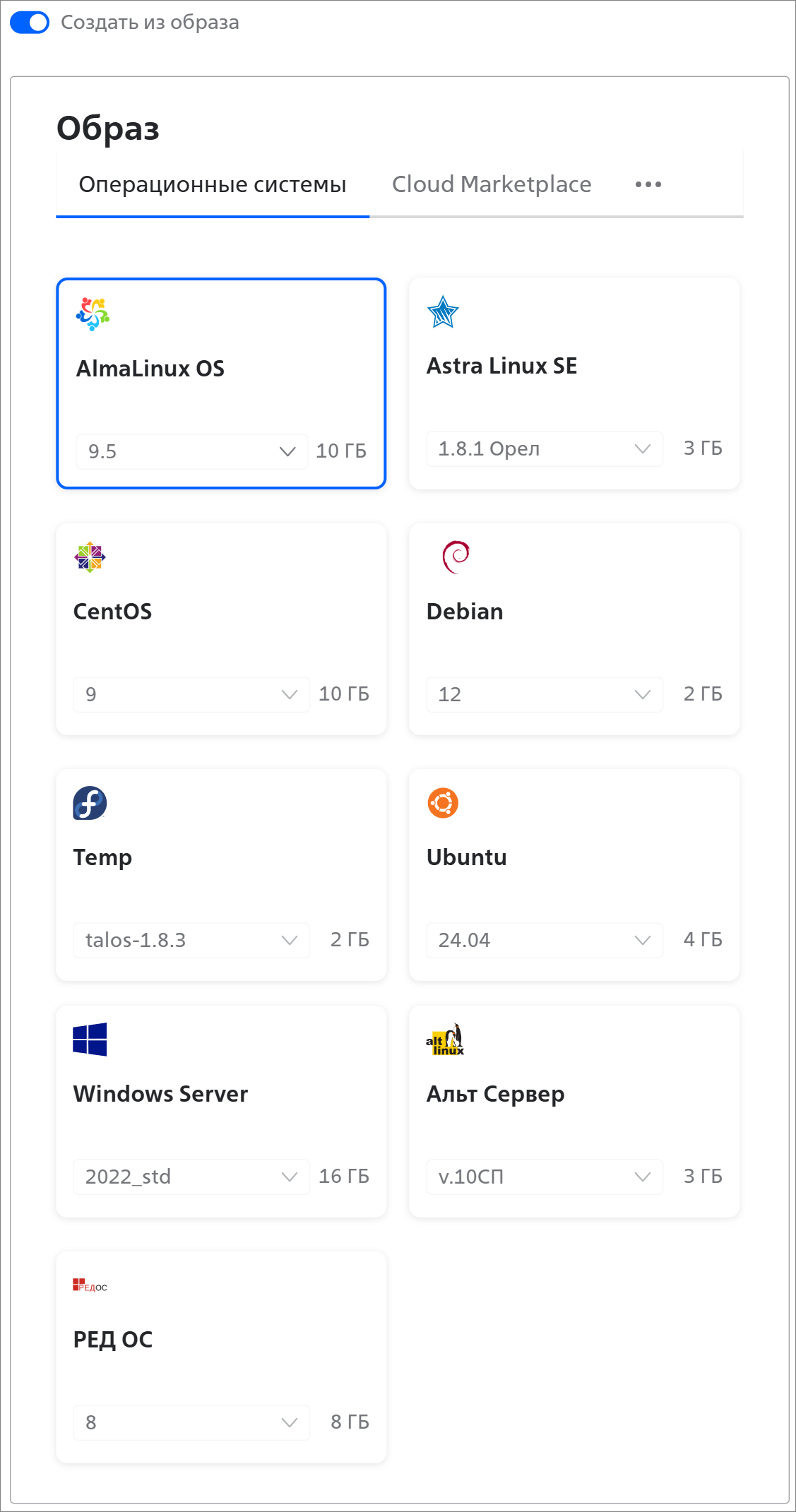 - Cloud Marketplace — образы приложений, доступные в выбранном Дата-центре;