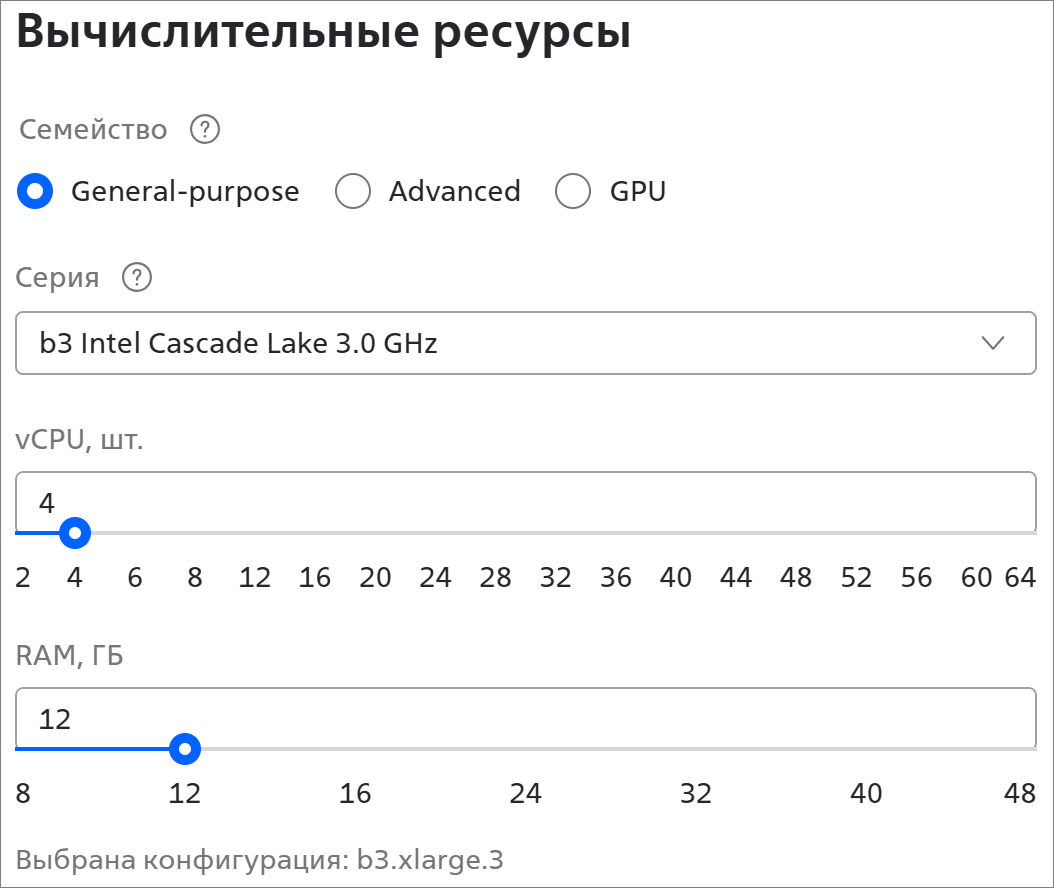 | Название конфигурации | vCPU, шт | RAM, ГБ |