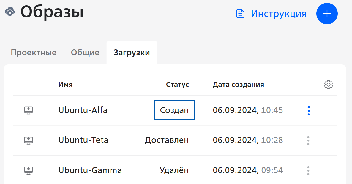 - Нажмите на кнопку Создать. Дождитесь, когда статус загрузки образа изменится на Создан: