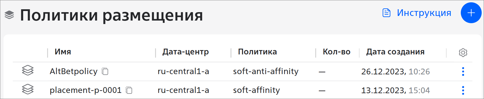 - В главном меню портала выберите Ресурсы → Cloud Engine → Политики размещения.