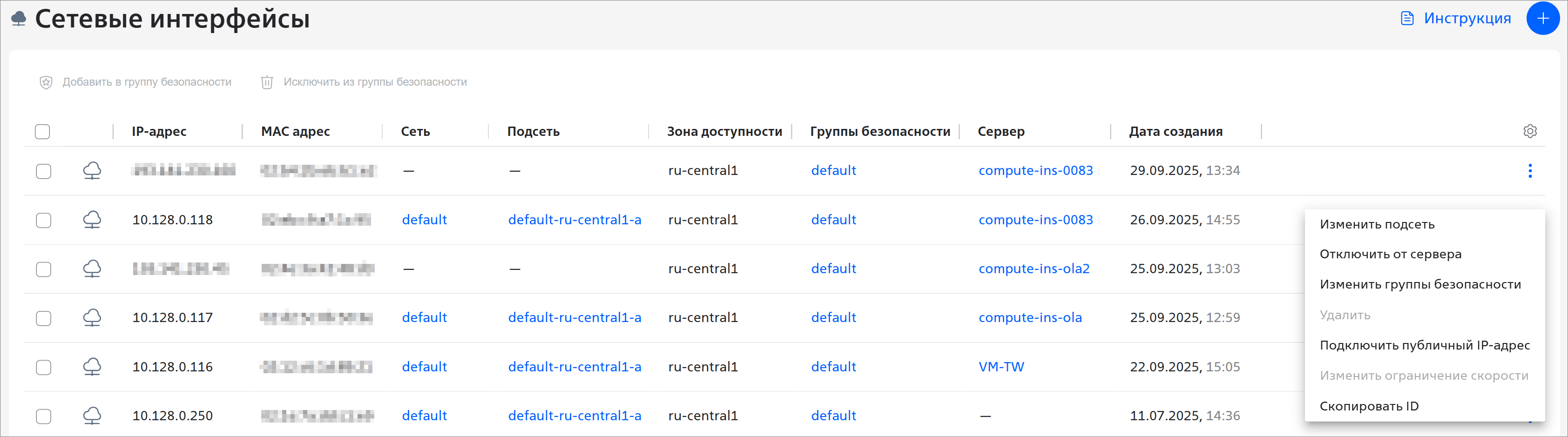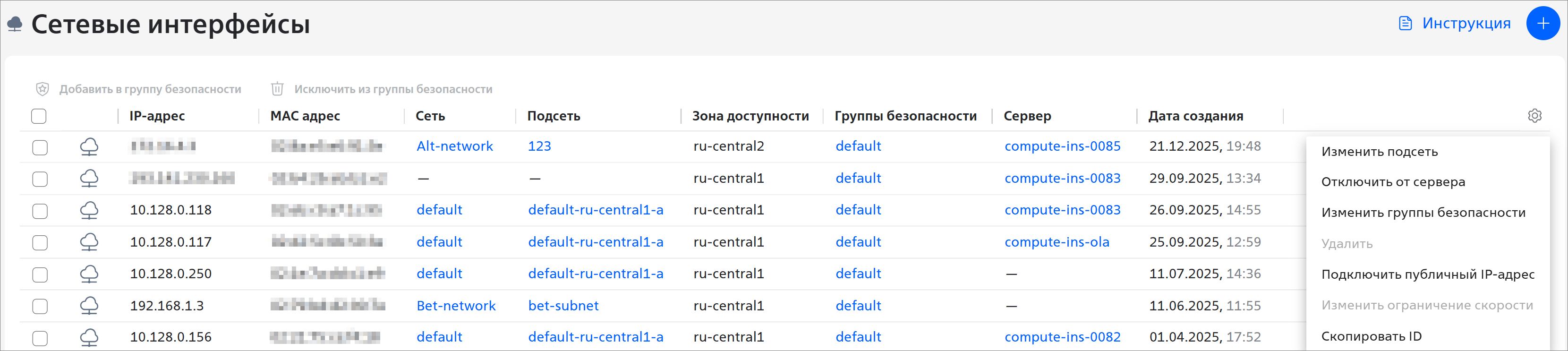 - В строке с сетевым интерфейсом, в котором нужно изменить группу безопасности, нажмите на кнопку и выберите пункт Изменить группы безопасности.