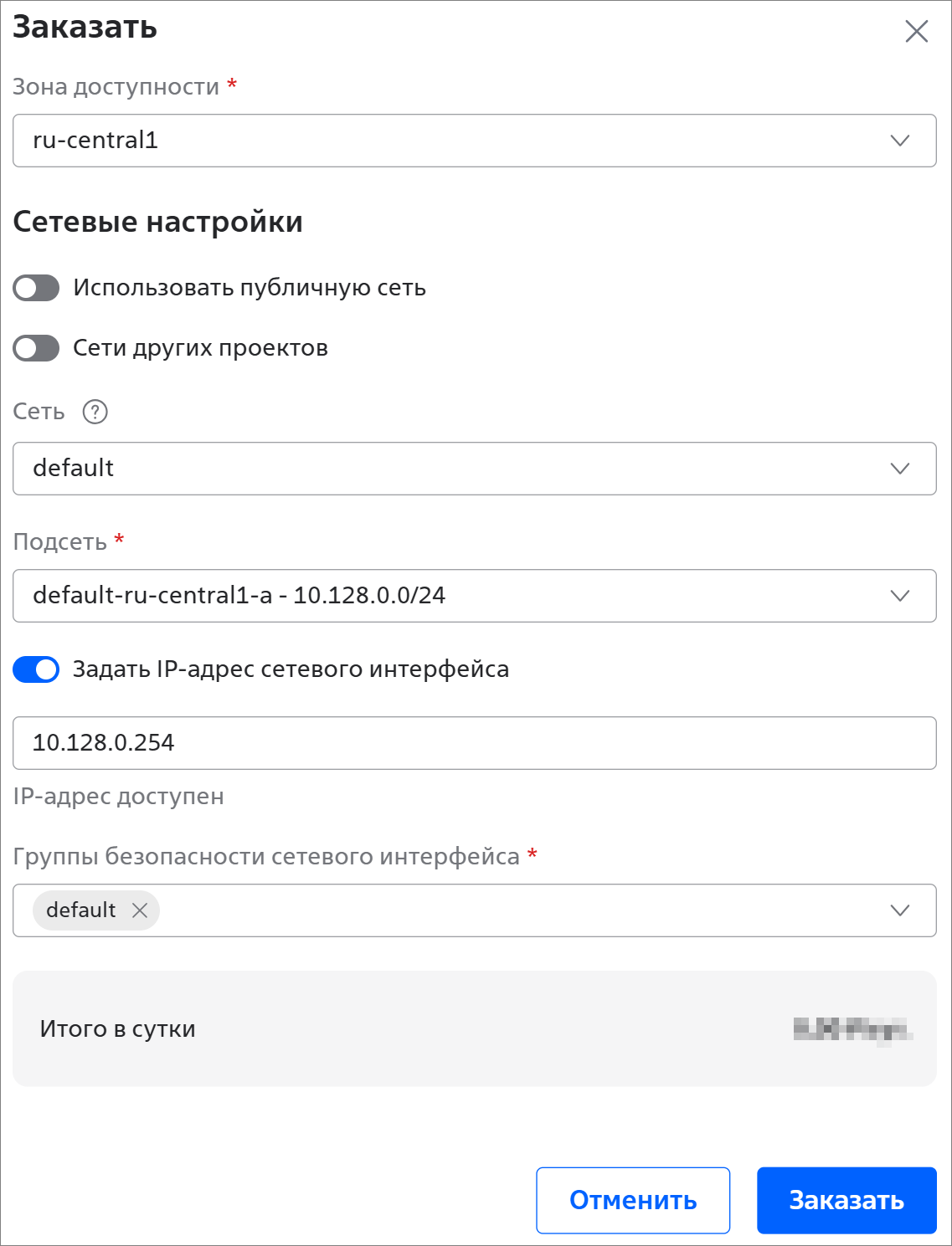 Сетевому интерфейсу автоматически присвоится статический публичный IP-адрес из пула свободных публичных IP-адресов;