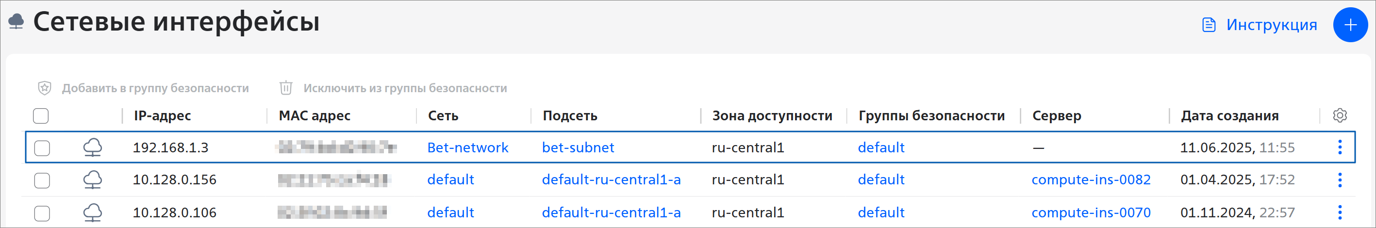 - Сеть — сеть, к которой будет подключен сетевой интерфейс. При необходимости создайте сеть;