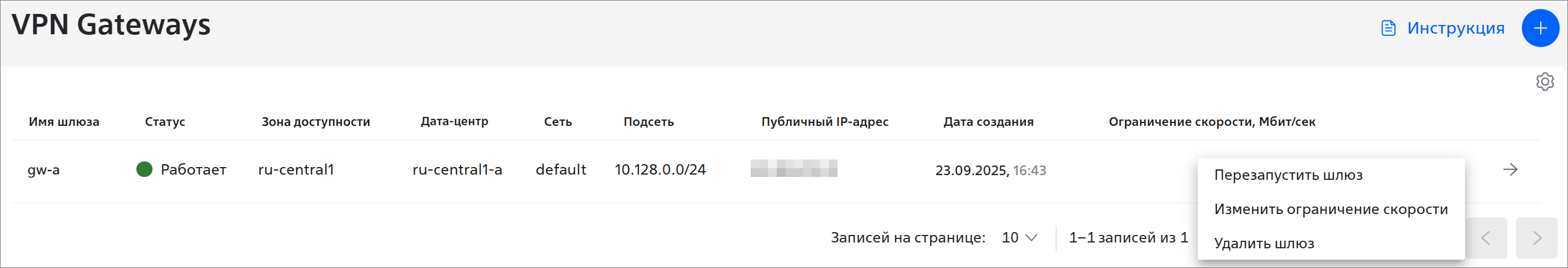 Для просмотра доступных действий с VPN-шлюзом нажмите на кнопку в строке с нужным VPN-шлюзом: