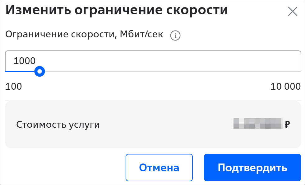 - В поле Ограничение скорости, Мбит/сек выберите новое ограничение пропускной способности канала. Значение должно быть кратно 100: