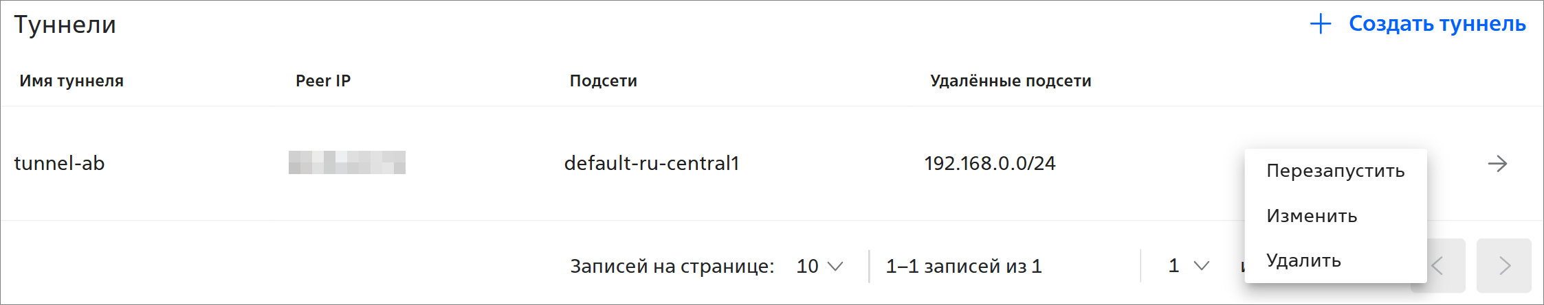 Для просмотра доступных действий с VPN-туннелем нажмите на кнопку в строке с нужным VPN-туннелем: