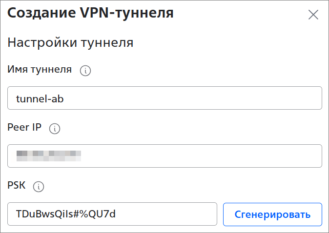 При создании VPN-туннеля для обоих VPN-шлюзов укажите одинаковые значения в полях PSK, Время жизни ключа IKE, Алгоритм хэширования, Алгоритм шифрования, Группа Диффи-Хеллмана и Время жизни ключа.
