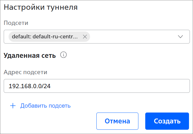 Если VPN-шлюз используется для нескольких подсетей, укажите любую из них. Маршрутизация пакетов будет доступна ко всем подсетям, входящим в сеть.