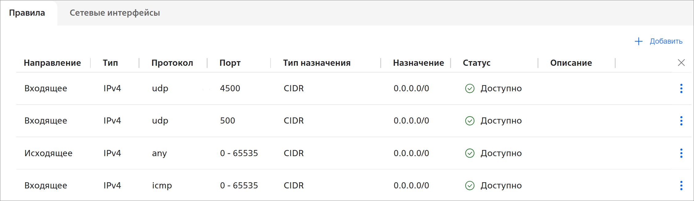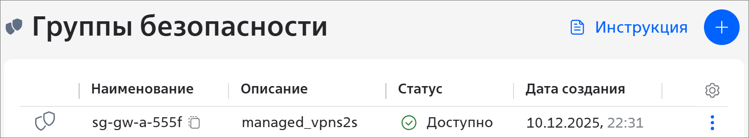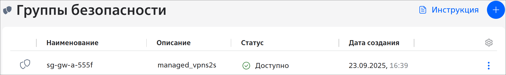 После создания VPN-шлюза автоматически создаётся группа безопасности sg-<имя VPN-шлюза>-<первые 4 символа идентификатора заказа VPN-шлюза>: