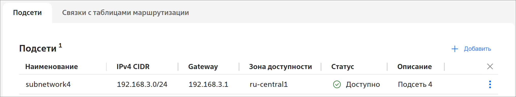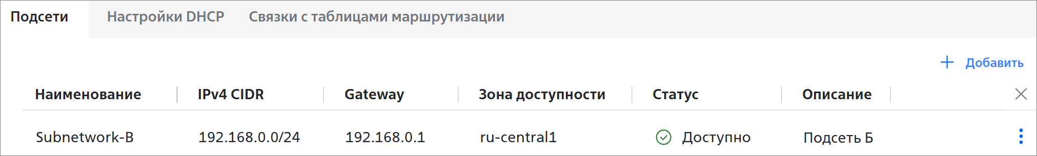 В нашем примере для стороны Б требуется создать подсеть в сети default. Созданная подсеть отобразится на портале со статусом Доступно: